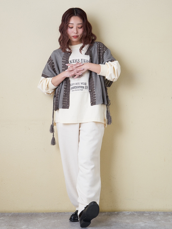 透け感のある編地でTシャツやワンピースに重ねるだけで季節感のあるスタイリングが完成します。