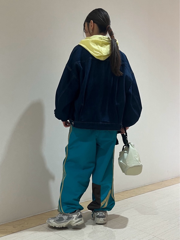 春らしいイエローとスポーティでおしゃれなグリーンのラインパンツをチョイス。