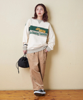 大胆な切替ラインに合わせてロゴをあえて見切れさせ、古着をリメイクしたような仕上がりに。