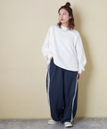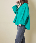ゆったりとしたドルマンシルエットとパフスリーブが女性らしいこなれ感を演出してくれます。