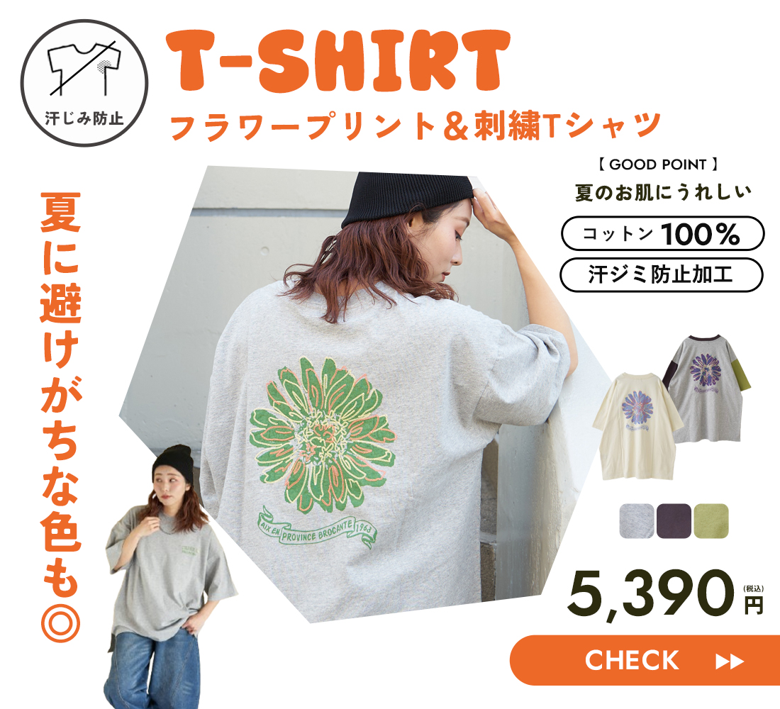 21/-OE天竺 汗染み防止加工 フラワープリント & 刺繍 Tシャツ